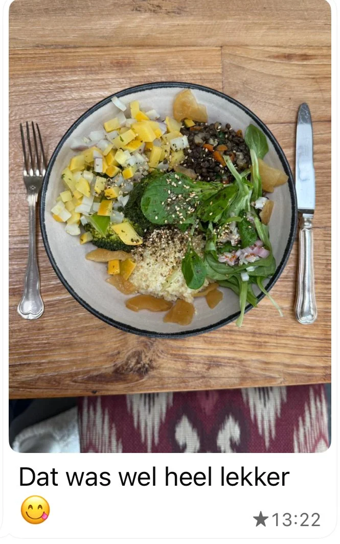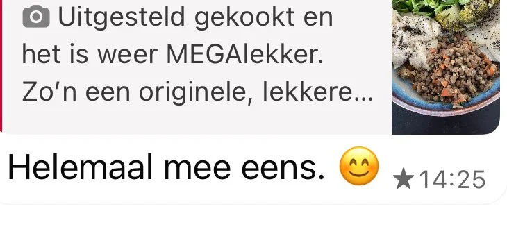 “Na 25 jaar 'sukkelen' met goed koken voor mezelf (wel voelen dat het heilzaam is, maar geen structuur zien en niet volhouden), heb ik eindelijk het 'kettingkoken' te pakken en zie ik de 'grotere' structuur. Eenmaal veel koken en dan restjes gebruiken voor een soepje, sushi, burger, etc... Daar ben ik zó dankbaar voor!”